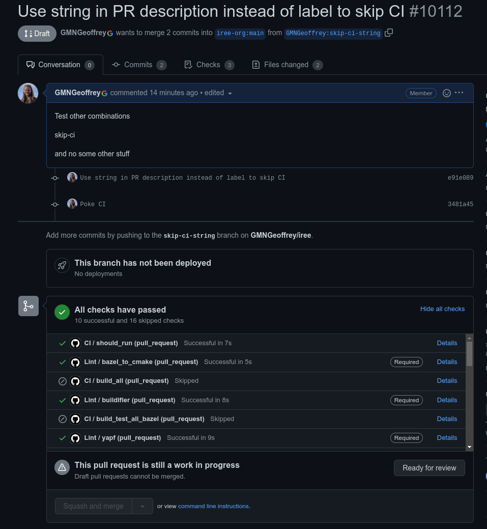 Use string in PR description instead of label to skip CI (#10112) As discussed in https://github.com/iree-org/iree/issues/10042, we discovered that using a label doesn't work for the very important case of when the PR is just created, so we're shifting to use the PR body instead. Tested: Created this PR with "skip-ci" as the entire body, which resulted in correctly skipping the CI. Also added some additional lines before and after, and CI was still correctly skipped. Finally, this PR body as written contains the string, but not on its own line and CI is not skipped. Just skip-ci: https://github.com/iree-org/iree/runs/7866417853 With other content in the PR body:  https://github.com/iree-org/iree/runs/7866417853